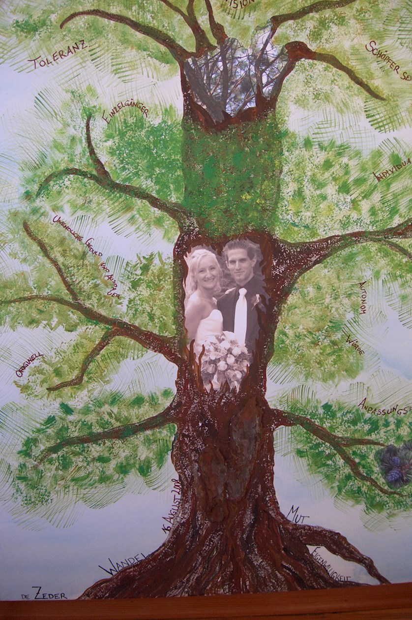 Auf Wunsch kann in der Baumkrone auch ein Foto des Paares mit integriert werden. Dies dient dazu, sich beim Betrachten ihres Bildes der tiefen Verbindung mit ihrem LebensBaum und ihrem Partner immer wieder bewusst zu werden und lässt sie als Einheit, fest verwurzelt und kraftvoll ihren gemeinsamen Lebensweg gehen.